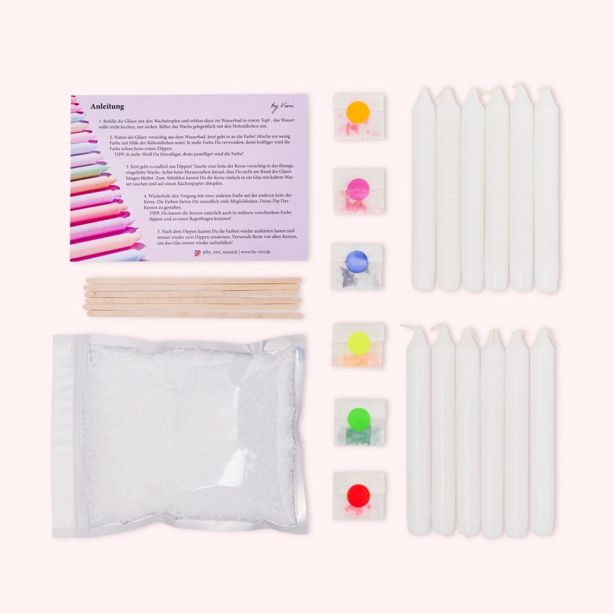 Unser Anspruch an Weihnachtsgeschenke unserer Kids an Gotti, Götti, Grosseltern ist: Keine Staubfänger! Es müssen Gebrauchsgegenstände sein. Solche, die das Herz erfreuen, weil vom Patenkind/Enkel selbstgemacht. Aber auch solche, die die Beschenkten entsorgen können, sobald gebraucht. Angemalte Zündhölzli-Schachteln, verzierte Kleenex-Boxen, selbstgemachte Seifen. Und: selbstverzierte Kerzen! Mit diesem Set hier könnt ihr bunte Dip-Dye-Kerzen gestalten, 12 auf einen Streich!