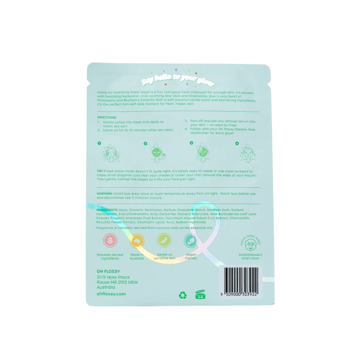 Die Oh Flossy Hydra Hit Sheet Mask ist eine kleine Wellness-Auszeit für Tweens und Teens. Sie spendet richtig Feuchtigkeit dank Hyaluronsäure, Aloe Vera und Kamille, beruhigt und pflegt die Haut. Als Extra enthält sie noch Erdbeer- und Blaubeerextrakte für diesen leichten Glow. Und dieser Duft 💭🤤! Ein süsser Kokosnuss-Vanille-Traum, der mega gute Laune macht.