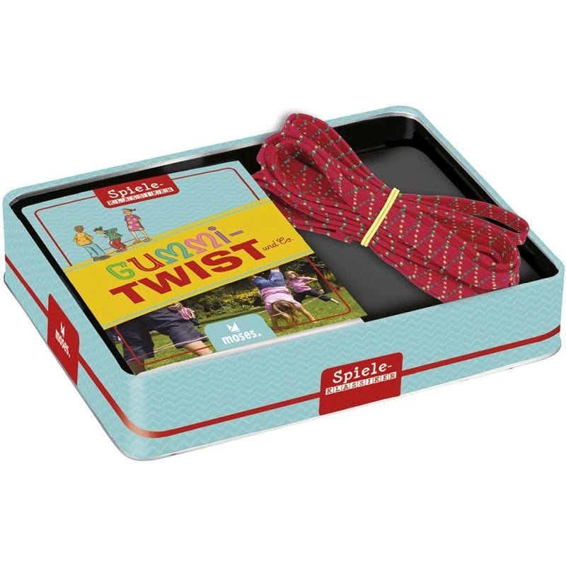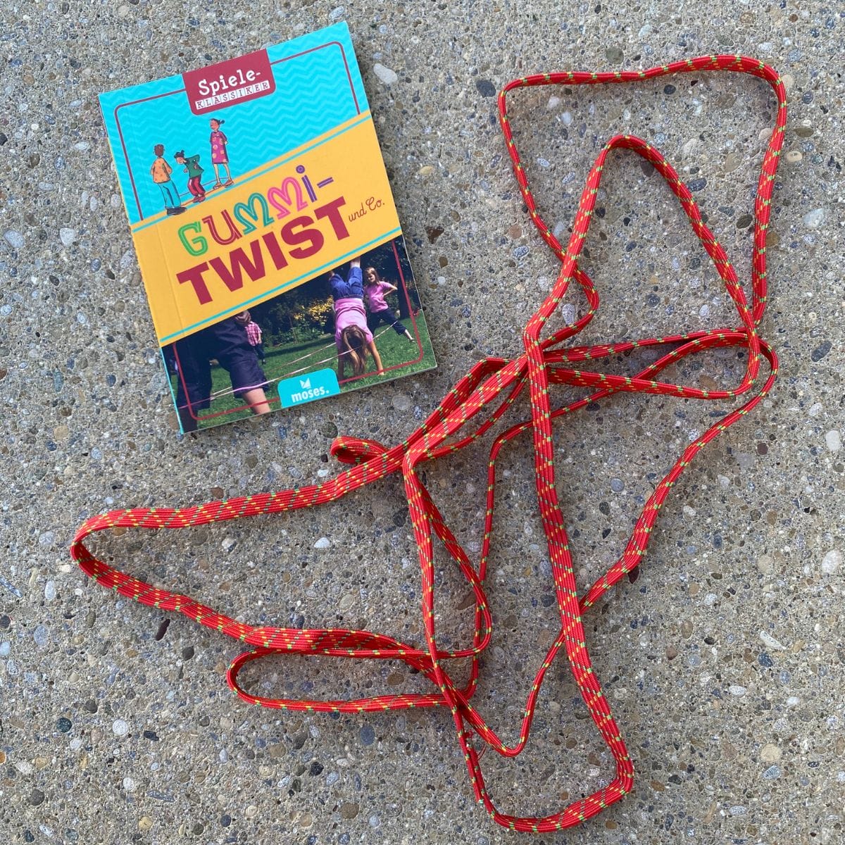 In nostalgischen Gefühlen schwelgend (ausgelöst durch die Frage unseres Tell me: Sets «Was hast du normalerweise nach der Schule gemacht?»), habe ich (Olivia) meinen Kids vom Gummitwistle erzählt. Haben sie natürlich nicht gekannt. Und weil ich die cheibe Zähner-Reihe nicht mehr in meinem Gedächtnis abrufen konnte, habe ich mich auf die Suche nach einer Anleitung gemacht. Nicht auf YouTube, sondern ganz old-school in gedruckter Form. Fündig geworden bin ich bei Moses: In einem Metallkistli befindet sich ein Gummitwist und eben ein 72-seitiges Booklet 📗.