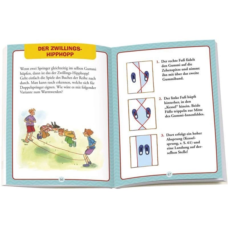 Im handlichen Büechli stehen viele Gummitwist-Klassiker wie „Hexenhaus“ oder „Hau-Ruck“, aber auch Spiele, die ich noch nicht kannte. Und die Zähner-Reihe – die offiziell aus 14 Schritten besteht und Alpha-Turnier heisst 🏆.