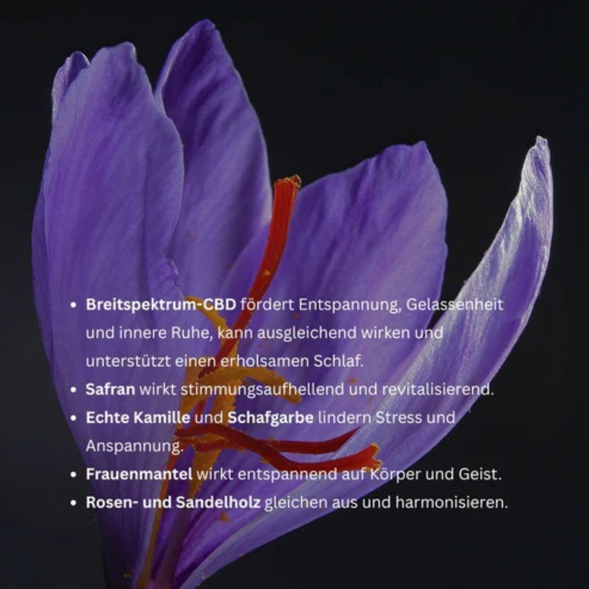 Inhaltsstoffe: Kamillen-Mazerat*, Schafgarben-Mazerat*, Breitspektrum-CBD*, Frauenmantel-Mazerat*, Safran Attar*