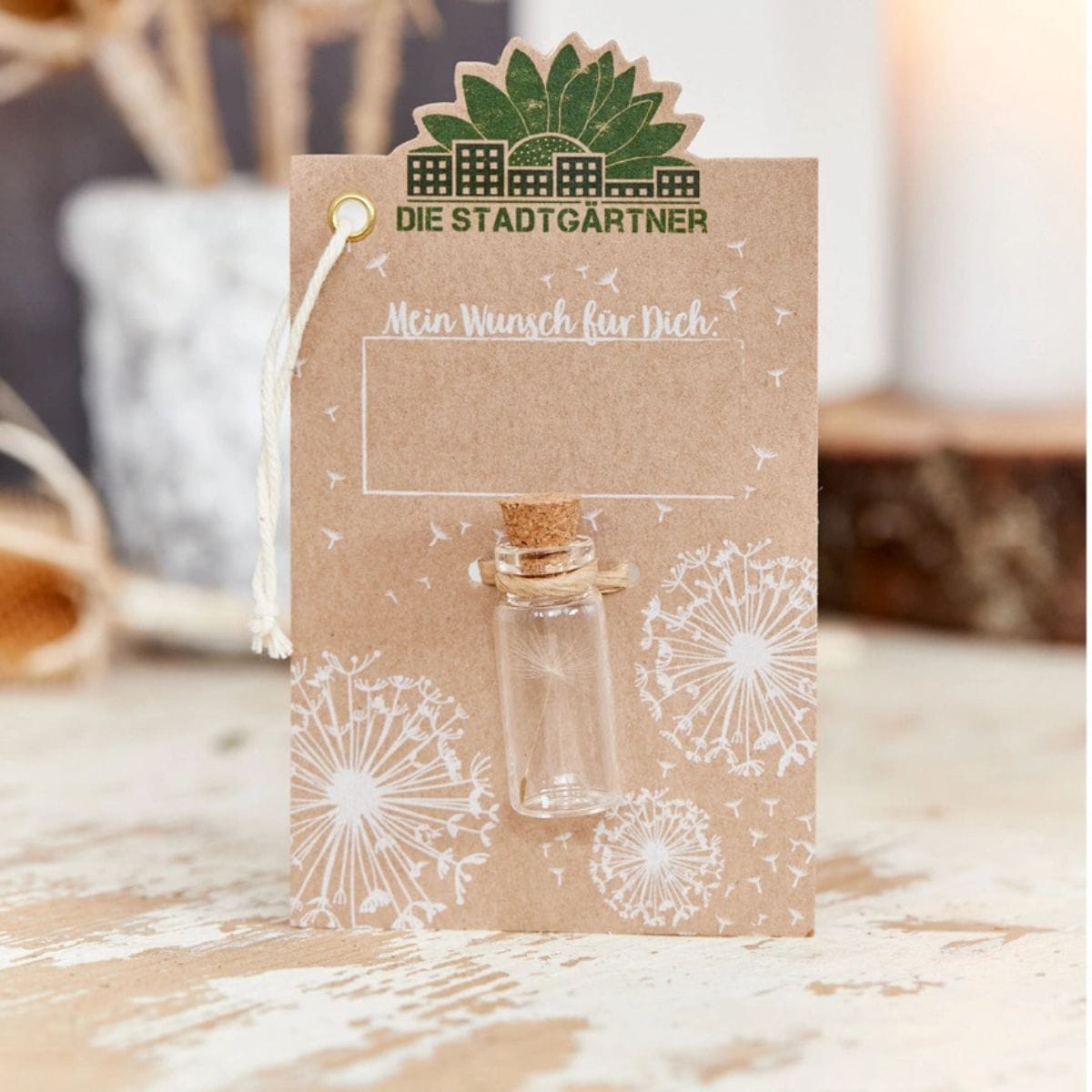 Das Glasfläschchen ist 3,8 cm gross und hat einen Korkverschluss. Darin steckt ein handgepflücktes Fliegerli von einer Pusteblume.